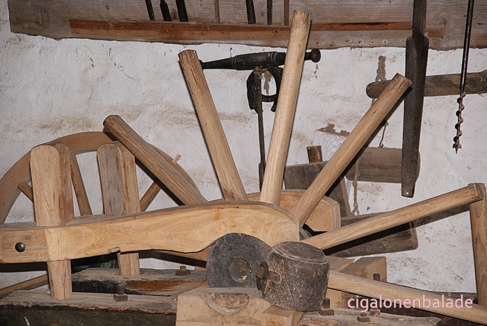 L’écurie qui fait partie de l’ensemble date quant à elle de la fin du XIXème siècle et a été construite avec les pierres trouvées dans les champs. Elle abritait des chevaux de trait utilisés pour les travaux forestiers. Derrière un petit moulin à vent doté de pales étroites et réglables qui avec le passage pour chevaux dans la cour servait à entraîner le coupe-paille, la batteuse et d’autres machines nécessaires à l’exploitation.