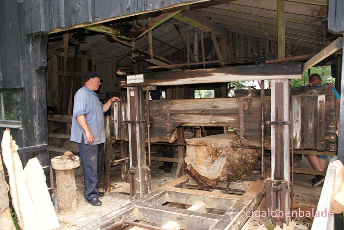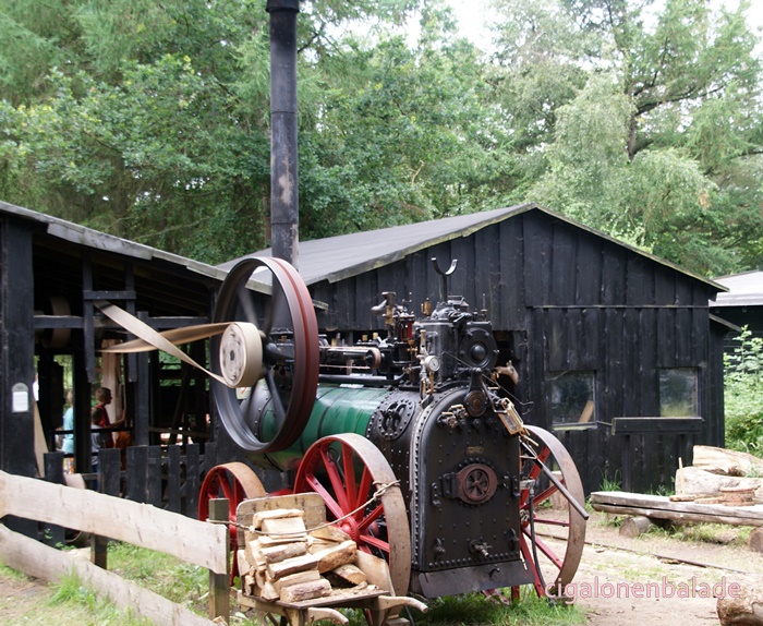 Dans la scierie, on trouve une scie à bûches, une scie à ruban et une scie à cadre actionnées par une machine à vapeur construite en Angleterre par Marshall & Sons Co.