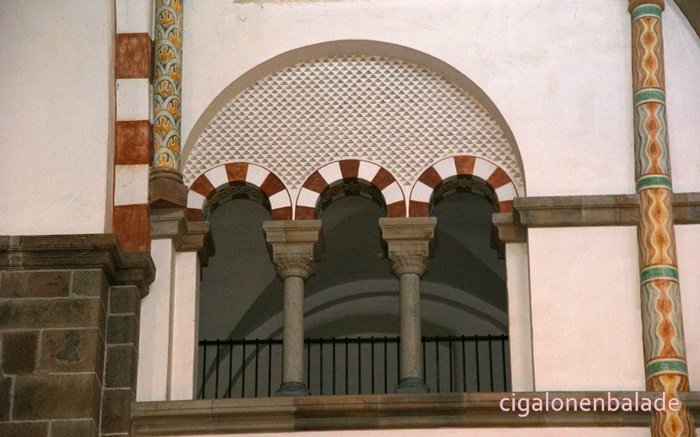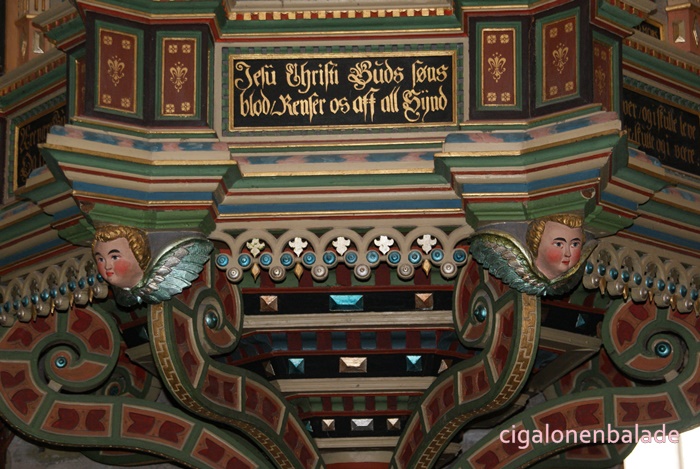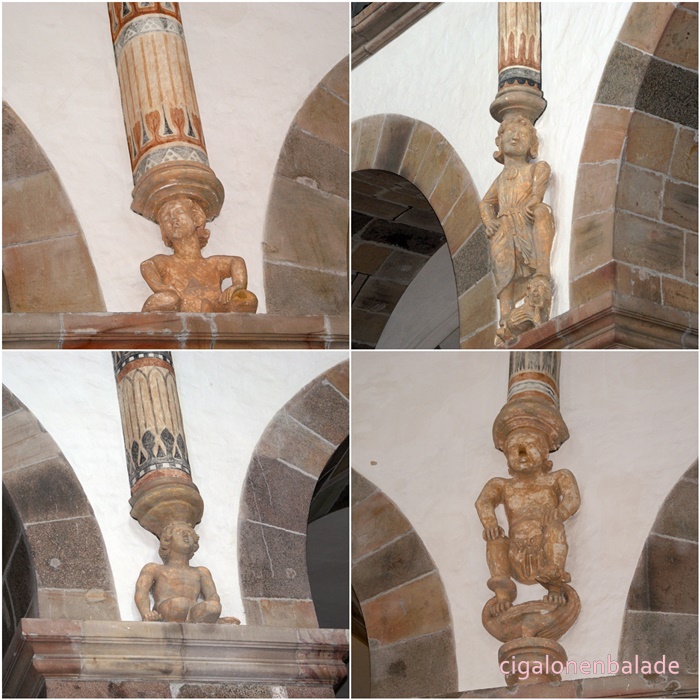 Les chapiteaux sont décorés par des petits bonhommes assis ou debout, à chaque fois différents, qui soutiennent eux aussi des colonnes peintes.