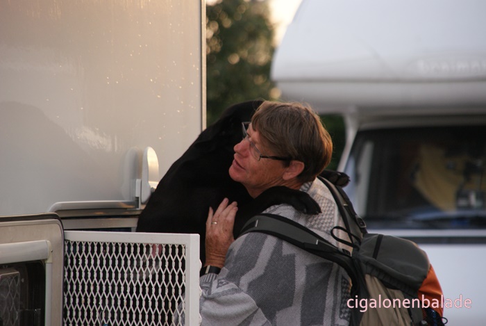 En revenant au camping-car, Douchka fait la fête à son maître ! A croire qu’on l’a abandonnée durant des heures !!