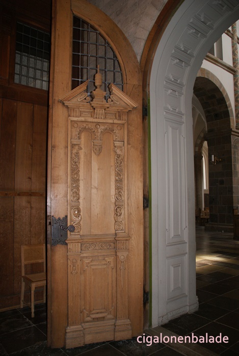 Autour de l’autel, les accoudoirs des stalles représentent des têtes de chiens.