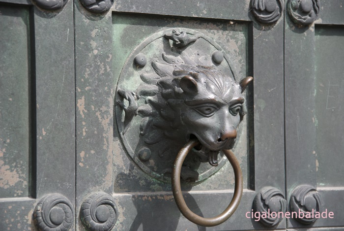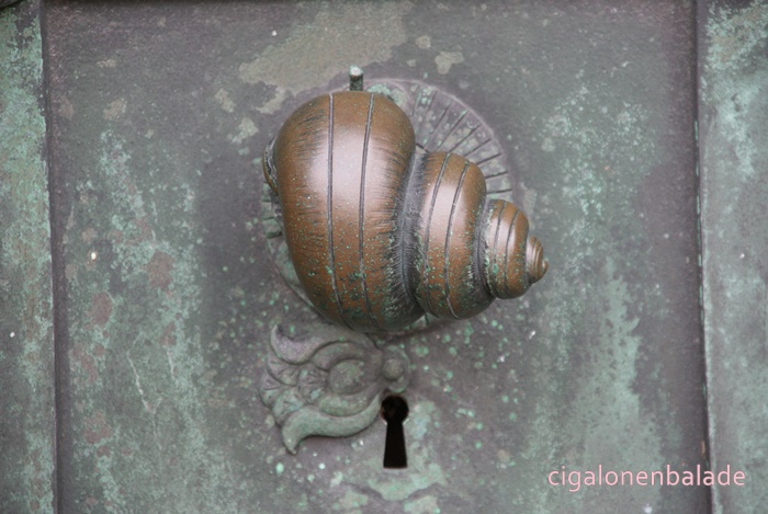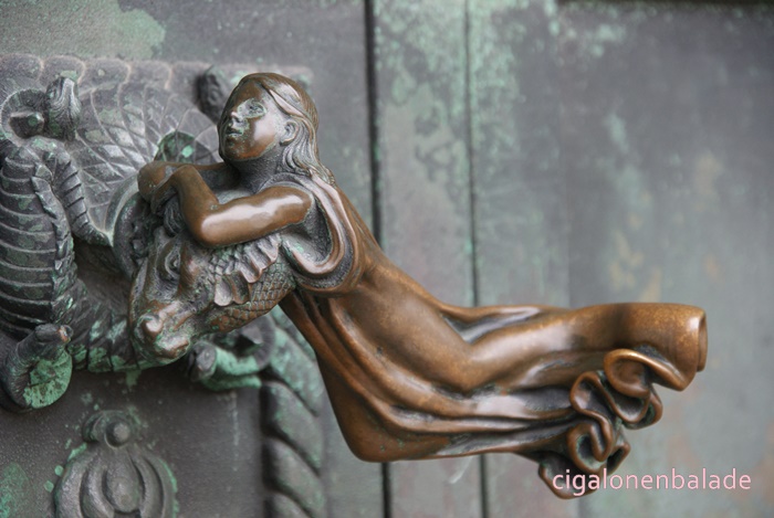 Avant d’entrer dans l’édifice, il ne faut pas manquer de regarder les portes remarquables pour la forme de leurs heurtoirs et poignées : un escargot, une fillette flottant, un lion, un paon.