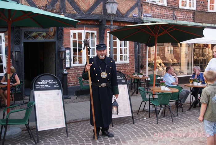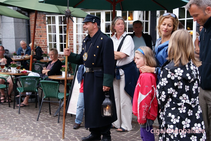Il chante la chanson du veilleur et s’arrête régulièrement pour raconter l’histoire de la ville. En danois, nous ne comprenons rien, naturellement …mais nous comprenons à présent pourquoi les Suédois disent que les Danois toussent quand ils parlent ! Notre garde tousse d’ailleurs aussi lorsqu’il fait son commentaire en anglais si bien que nous ne comprenons absolument rien !