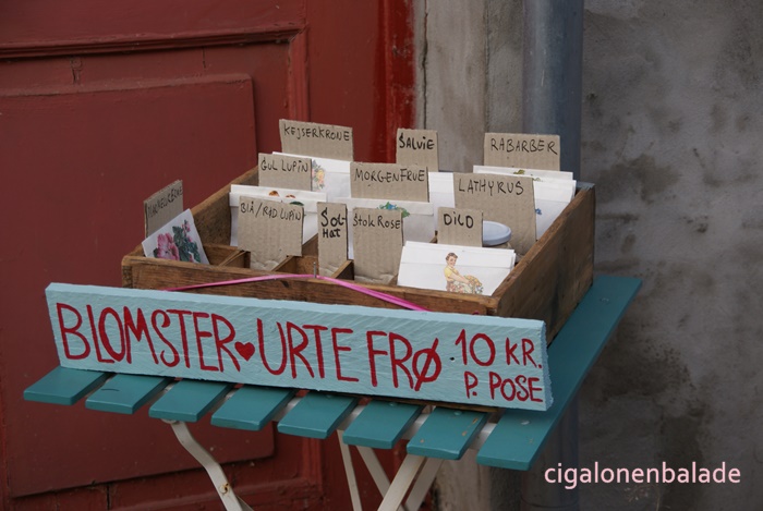 Nous poursuivons notre balade dans la ville. Presque chaque maison est digne d’être photographiée mais nous découvrons aussi de drôles de choses : un guéridon kitch au possible et une vente de graines de plantes en libre service. Dépaysement garanti, je ne m’en lasse pas …. Seul Gabriel s’impatiente : il a faim !