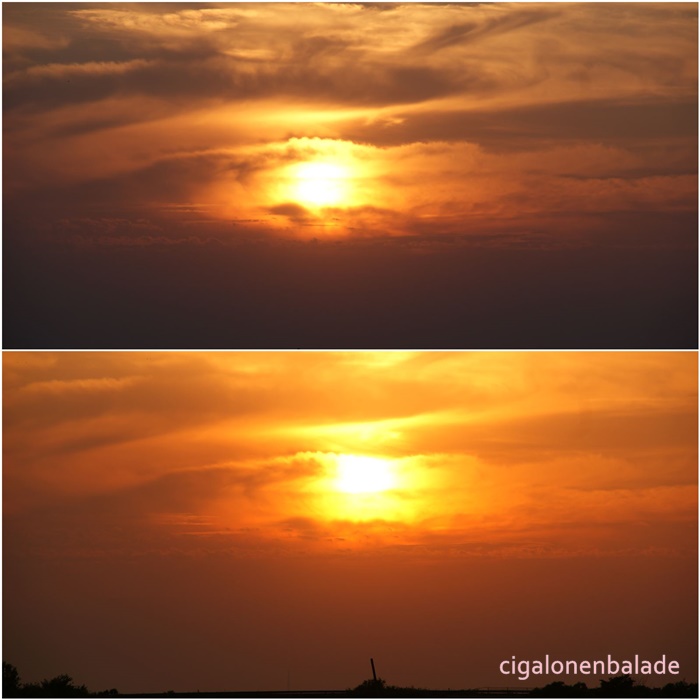 Le soleil a bien du mal à se coucher et le ciel garde un bon moment ses reflets rougeoyants. Nous abandonnons notre attente pour rejoindre le camping-car car il se fait tard.