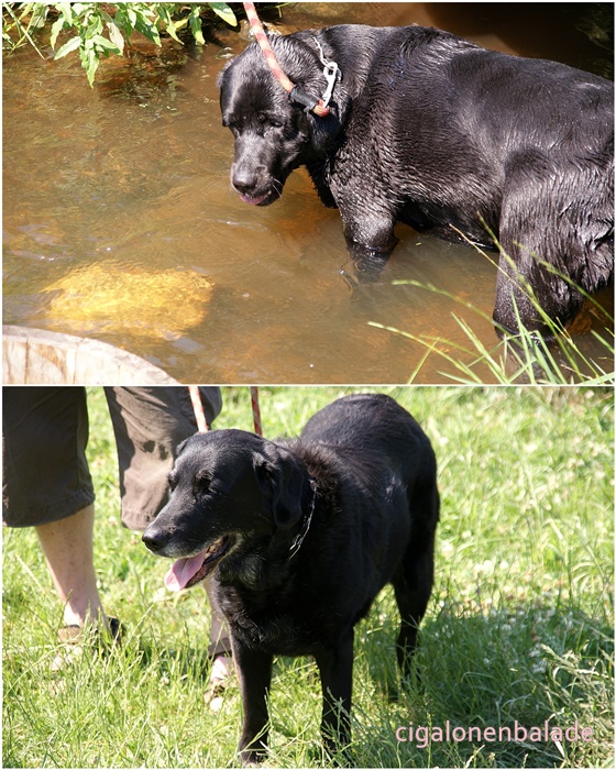 En allant voir les archers, Douchka repère un petit cours d’eau et en moins de temps qu’il ne faut pour le dire, elle tire sur sa laisse et se retrouve dans l’eau. Son maître ne sait pas ce qui lui arrive ! Osiris réclame aussi sa baignade.