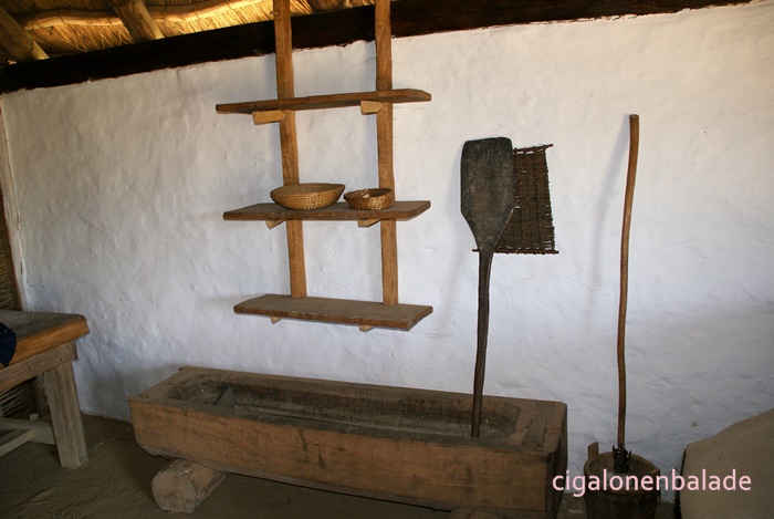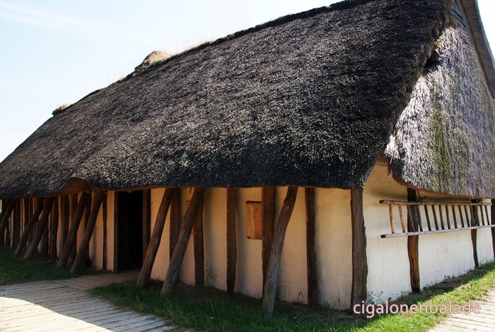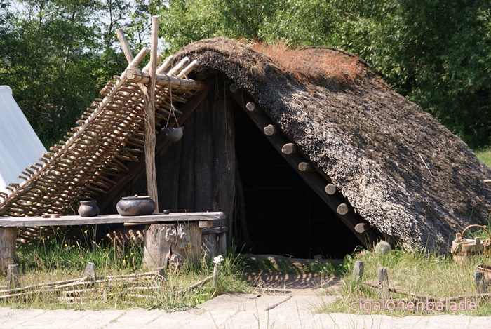 Toutes les maisons sont couvertes de chaume. Les murs étaient faits de branches tressées autour de poteaux en bois et recouvertes de torchis.Certaines maisons sont même enterrées. On y trouve une relative fraîcheur aujourd’hui. Elles sont meublées avec des imitations d’objets d’époque.