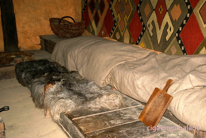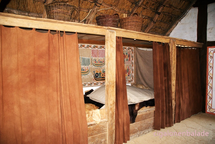 L'âtre, au centre, des banquettes en guise de chaises, une meule à main pour transformer le grain en farine, des lits clos pour un peu d'intimité.