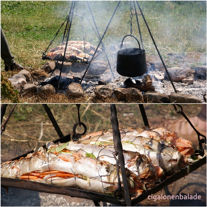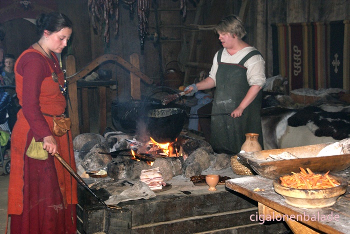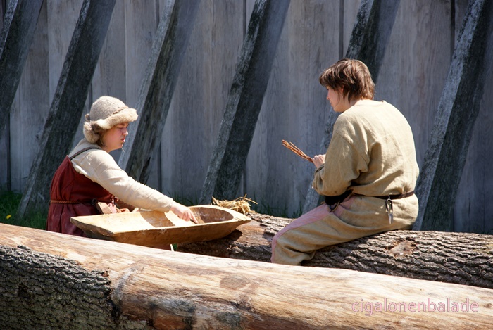 A notre entrée, certains Vikings sont en train de faire à manger : du saumon sur le grill, de la soupe ... Partout on s’affaire mais de préférence à l’ombre car le soleil tape aujourd’hui. Et sans cesse on va remplir la cruche à la fontaine, en l’occurrence ici un simple robinet !