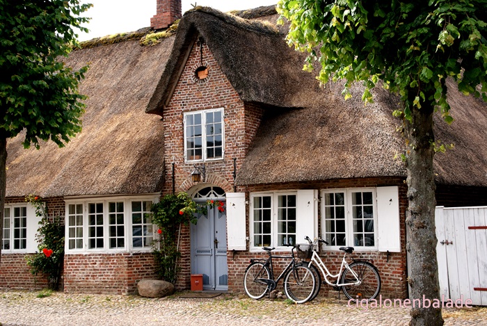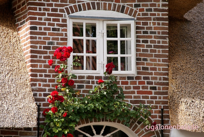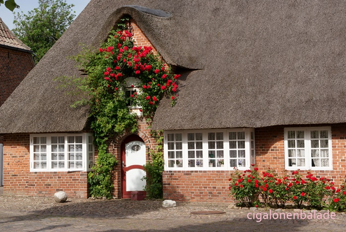 Bâties en briquettes de couleurs, peintes ou chaulées, certaines sont recouvertes de chaume. Là aussi, des rosiers poussent le long des façades.