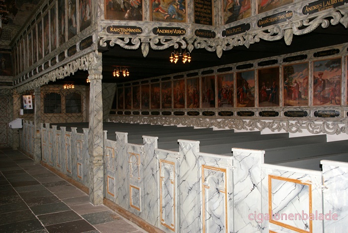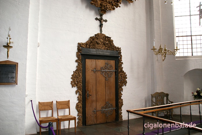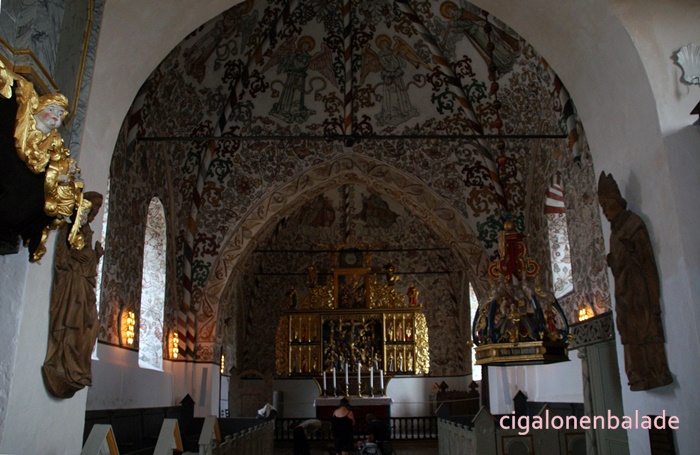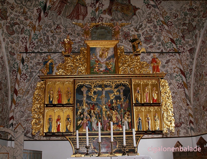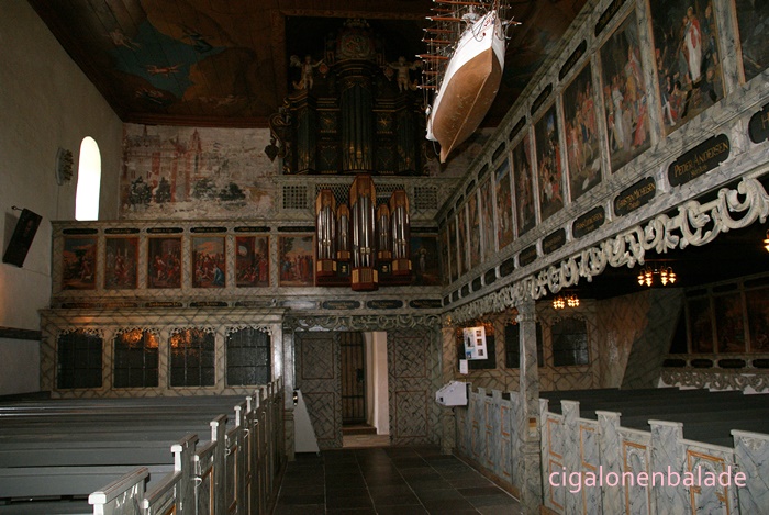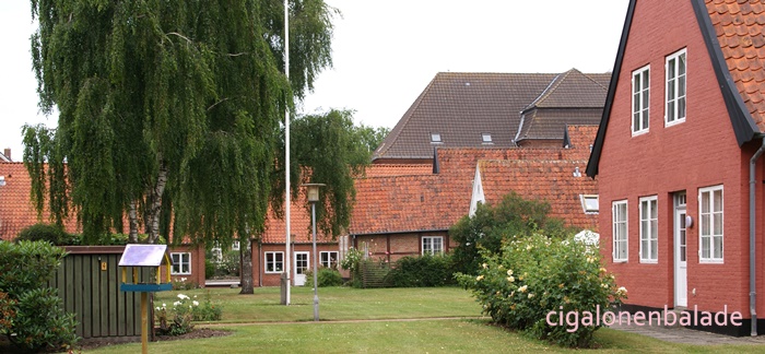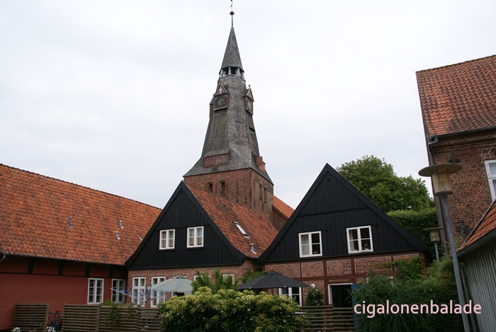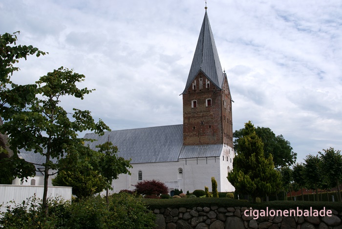 Nous aboutissons à l’église St Nicolas du XIIème siècle, entourée de son petit cimetière. C’est l'une des plus grandes du sud du Jutland et son clocher avec sa haute flèche octogonale servait de phare pour les marins dans les marais environnants. En 1680, une rue fut tracée à partir de l’église jusqu’au manoir.