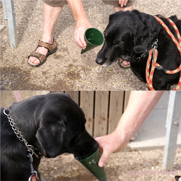 Pendant que je visite l’église, Gabriel s’installe dans le cimetière conçu comme un lieu de promenade. Il fait à nouveau chaud et une petite halte à l’ombre fait du bien. Heureusement que souffle toujours un petit vent, ce qui rend la chaleur supportable. Les chiennes ont soif et les vases coniques mis à disposition à côté des points d’eau font l’affaire, surtout pour Douchka qui boit à tous les râteliers.