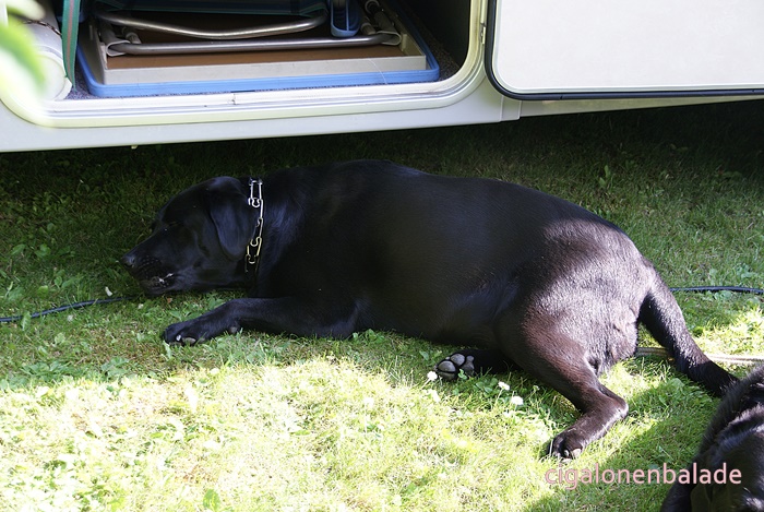 Un bon croûton pour les chiennes. Douchka va le manger sous le camping-car pour ne pas se le faire voler.