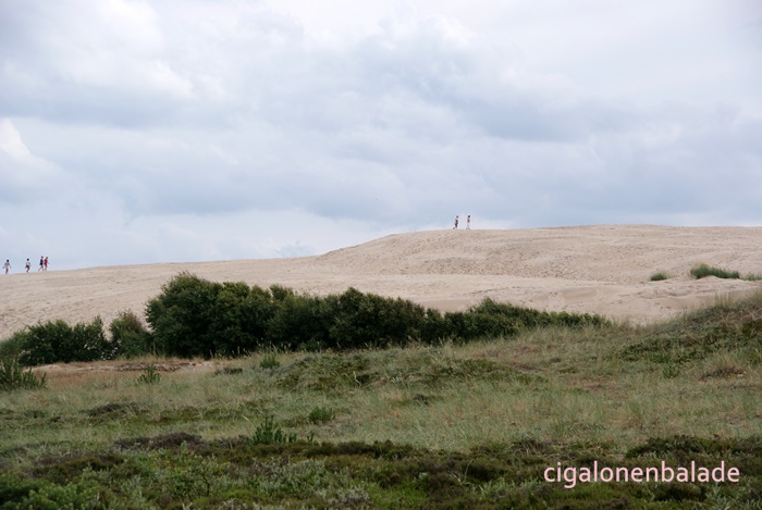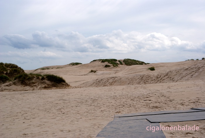 Finalement, en suivant le ruban noir, j’accède pratiquement au sommet de la dune sans aucun effort. Je photographie la vaste étendue de sable clair seulement piqueté par endroit par des bosquets d’oyats.