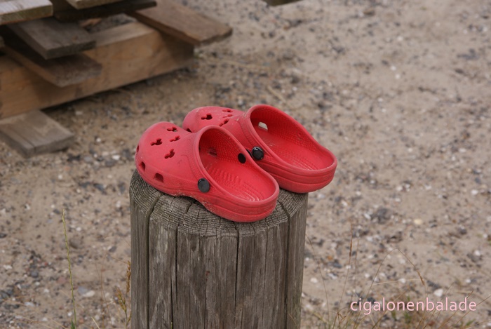 De temps en temps, l’on rencontre une paire de chaussures abandonnées …Les Danois n’ont pas peur de rentrer pieds nus. D’ailleurs, ils ne semblent pas craindre le vol en général. Ils laissent leurs vélos et les carrioles qu’ils tirent sans surveillance.
