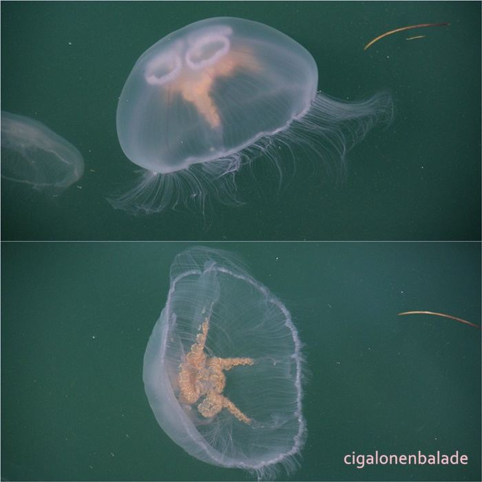 Pendant que je poursuis mon compte-rendu, Gabriel promène les chiens et découvre un nombre impressionnant de méduses. Et me voilà à pied d’œuvre pour photographier ces vilaines bêtes. Ce sont les premières que je vois et leur apparence n’est pas désagréable et plutôt gracieuse. Elles semblent se mouvoir en un ballet marin, s’ouvrant et se refermant au son d’une musique uniquement audible par elles. On distingue très précisément leurs cils.