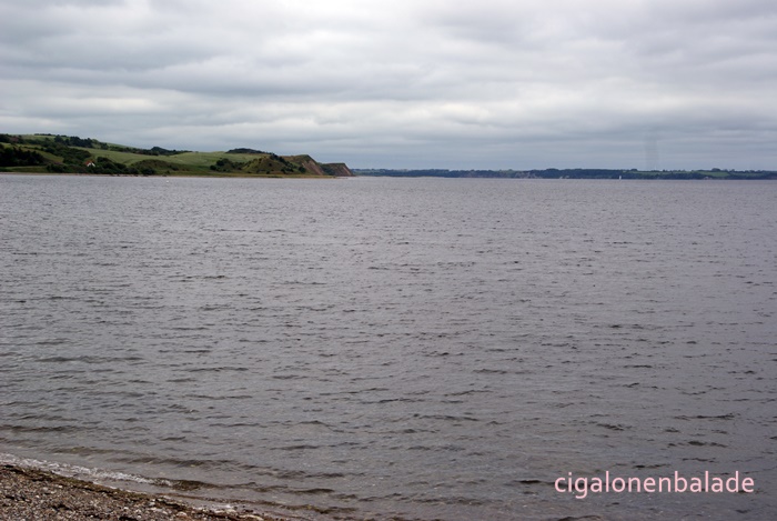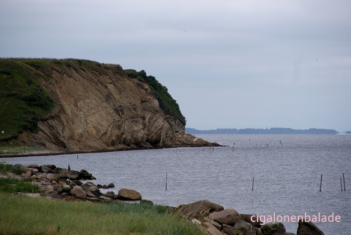 Aujourd’hui, c’est une incursion sur l’Île de Mors qui nous attend. D’une surface de 367 km², elle se situe dans le Limfjord et est rattachée à la terre par un pont levant qui enjambe le fjord. Le paysage change. A présent, se déroulent devant nous une succession de collines couvertes de cultures qui se terminent par des falaises tombant dans l’eau du Limfjord. Les fermes, disséminées ou regroupées en tout petits villages, n’ont plus le charme de celles rencontrées sur la digue de Ringkøbing.