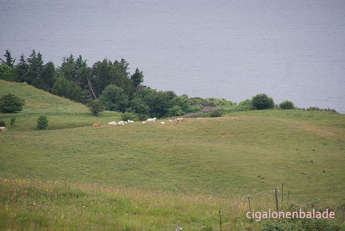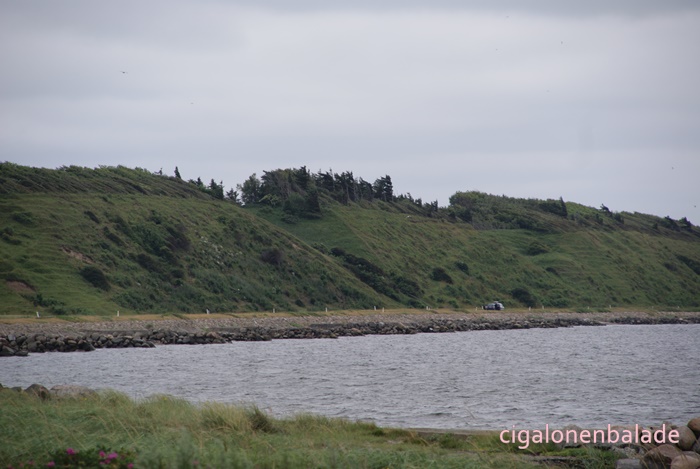 Une route étroite nous mène aux falaises de Hanklit. Heureusement que les Danois roulent lentement ! Un parking au bord du fjord accueille Cigalon.