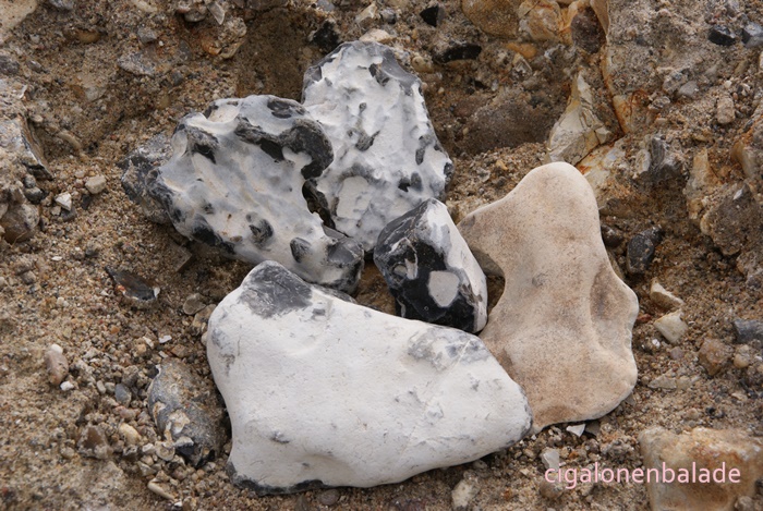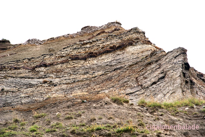 Les falaise sont constituée de cendres volcaniques et de craie. Nous en ramassons quelques « cailloux » bigarrés blancs et noirs pour ma collègue Claire. En cas de fort vent, le passage est inutilisable car l’eau monte. Aujourd’hui, l’eau est agitée d’un petit clapotis, peu dangereux. Un sentier raide et rendu glissant par la pluie nocturne mène au sommet.