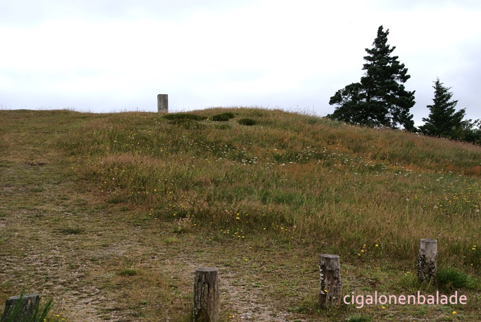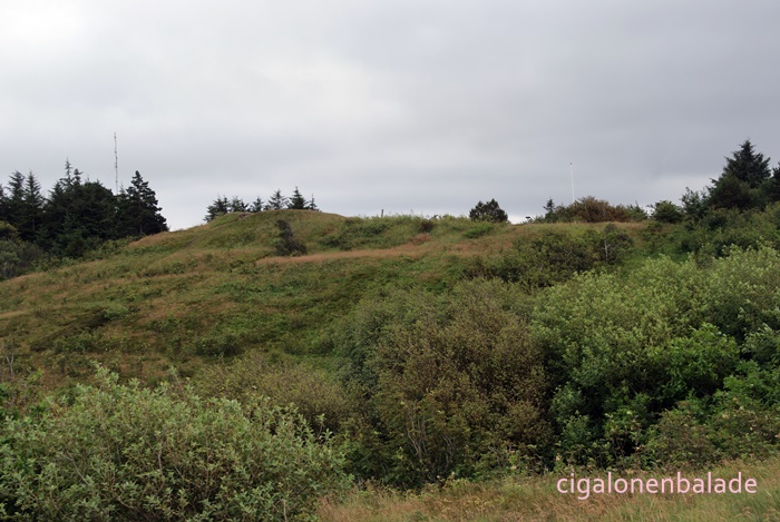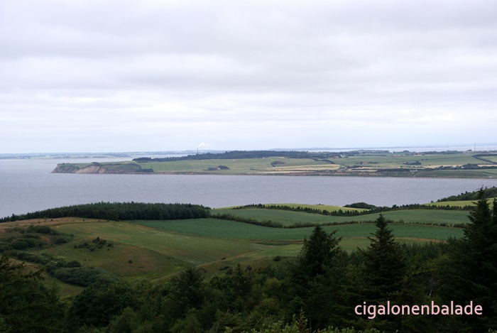 Pour déjeuner, nous nous arrêtons sur le petit parking au SalgjerhØj, où se situe le point culminant de Mors, sur un tumulus datant de l’âge du bronze, d’une altitude de 89 m – on ne rigole pas ! – et d’où la vue à 360° porte sur la majeure partie de l’île. Un pic … arrondi surmonté d’une pierre.