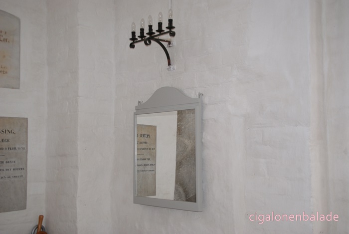 En ressortant, dans le narthex, je repère un miroir accroché au mur. Ce n’est pas la première fois que je vois cela. Cette fois le miroir est complété par un lavabo….