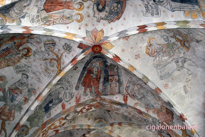 On peut avoir un aperçu de la hauteur de la précédente voûte grâce à une fresque située sur le mur nord qui date d’avant la transformation de l’église paroissiale en abbatiale.