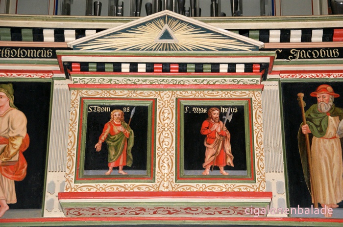 Belle tribune d’orgue avec des peintures représentant les 4 évangélistes.