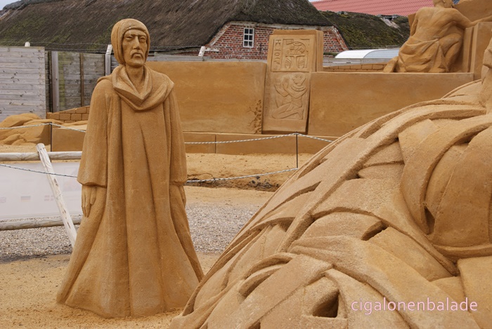 Un petit passage à l’OT où l’hôtesse essaie de dire quelques mots en français – c’est tellement rare qu’il faut le noter ! - nous permet de situer le festival des sculptures sur sable. Nous avons préféré laisser les chiens dans leur niche car avec la pluie récente, j’ose à peine imaginer leur état au retour de la visite. Néanmoins comme presque partout au Danemark, ils ont droit d’entrer, tenus en laisse. Nous voyons d’ailleurs peu d’interdictions. Les Danois ont l’air de s’auto-discipliner. On peut être surpris du peu de papiers qui traînent au sol. Peut-être dû au grand nombre de poubelles installées un partout ? Pas de mégots non plus d’ailleurs … Propre …