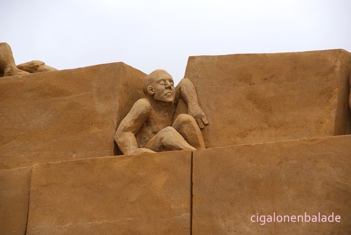 On pourrait se poser la question si le sable ne se désagrège pas lorsqu’il pleut. Non, car l’eau se contente de s’infiltrer dans le sable qui est déjà humide. Les sculptures sont destinées à durer trois/quatre mois selon les conditions météorologiques (vent et pluie).