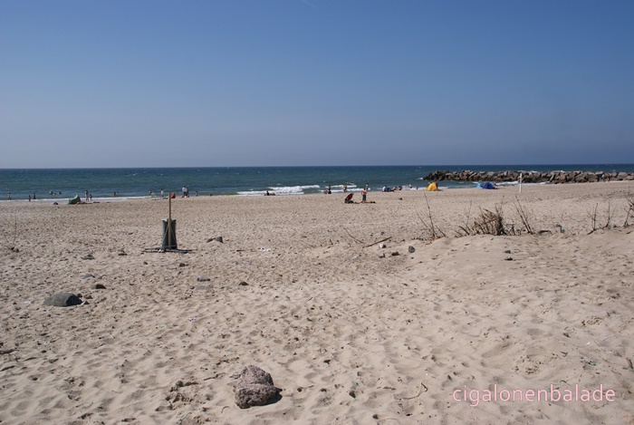 Nous commençons notre promenade par la digue. Elle nous permet de jeter un regard sur la plage de sable fin classée « pavillon bleu ». Malgré le vent, des gens se baignent ! A noter que même là les chiens tenus en laisse sont admis.