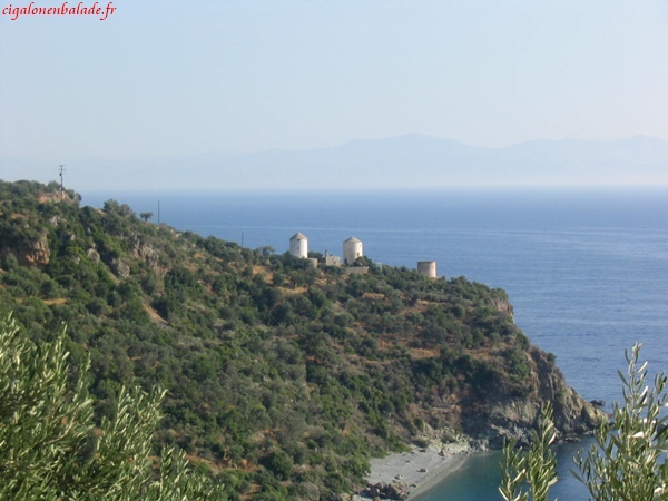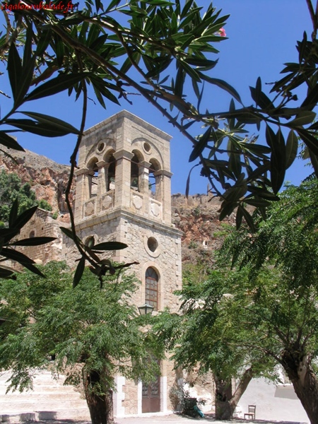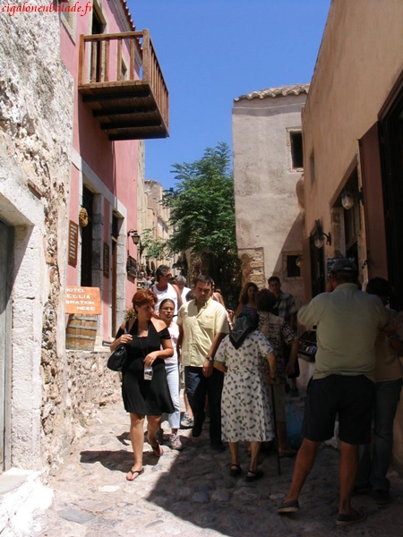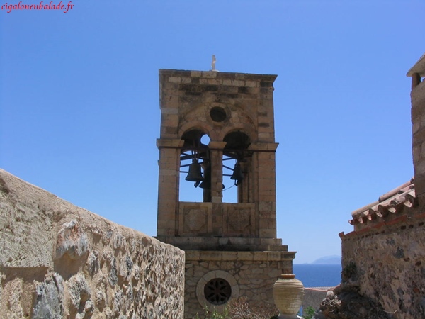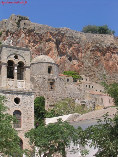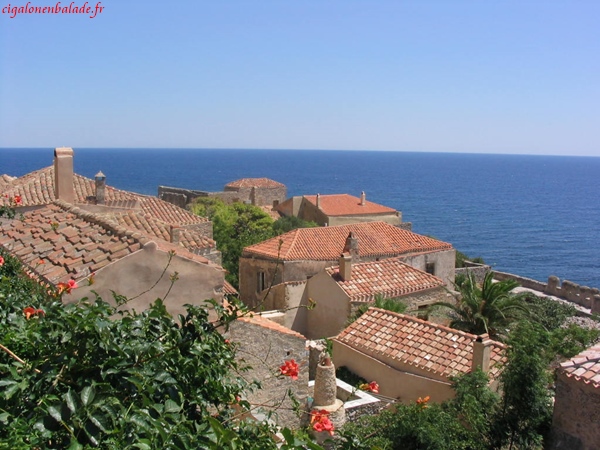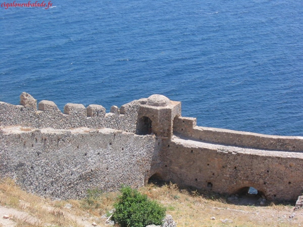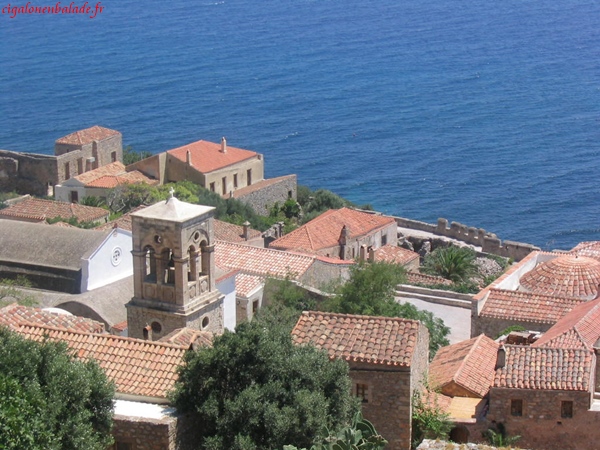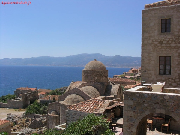 Monemvassia,« l’unique entrée » était un endroit stratégique ; il permettait de contrôler le sud du Péloponnèse. Comme bien d’autres endroits, elle fut successivement la propriété des Francs, des Vénitiens, des Turcs. Nous parcourons la ville basse sous le soleil à son zénith et n’avons pas le courage de grimper jusqu’au sommet du rocher, 350 m plus haut. Nous montons néanmoins un peu sur le chemin pour jouir d’une vue magnifique sur le village et sur la mer d’un bleu éclatant.