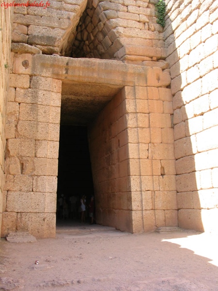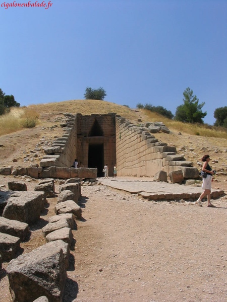 Un peu plus loin, sur une autre partie du site, le trésor d’Atrée, aussi appelé tombeau d’Agamemnon est l’exemple parfait de l’architecture funéraire mycénienne. On y pénètre par un dromos de 36 m de long taillé dans le roc auquel fait suite une porte monumentale qui s’ouvre sur une coupole d’environ 14,50 m de diamètre sur 13 m de haut