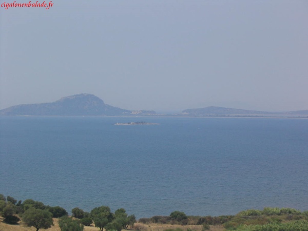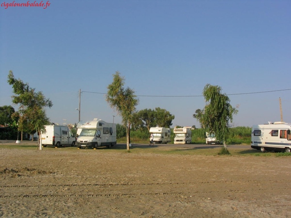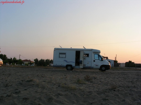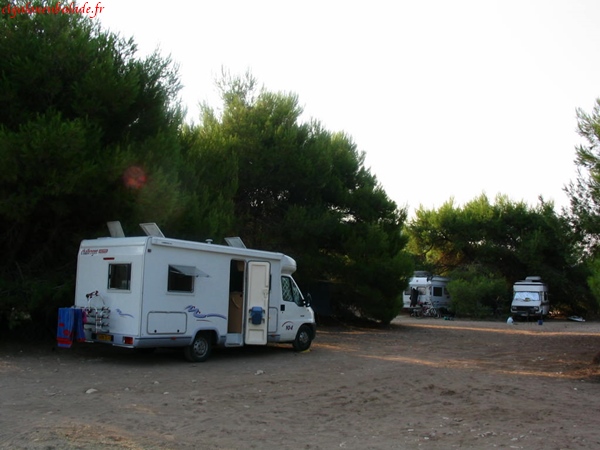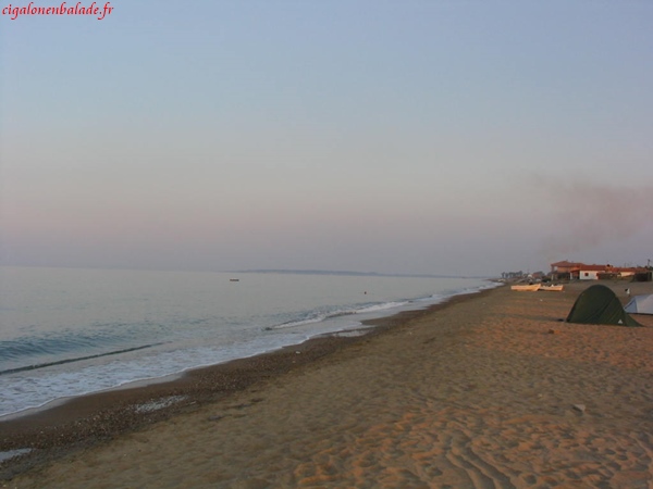 Nous passons la nuit à Elaia dans une grande pinède interdite au camping ! Il y a des dizaines de tentes, caravanes et camping-cars disséminés sous les pins !