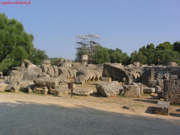 C’est sur l’Altis que se dresse le plus grand temple du Péloponnèse, celui de Zeus Olympien. Du temple, de style dorique, construit dans du calcaire coquillier, il ne reste plus que les colonnes posées sur le sol dans un chaos impressionnant